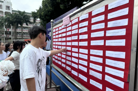 在知(zhī)識競賽活動中,同學們爭先從展板撕下(xià)題(tí)目現場作答(dá),領取小獎品,現場氛圍活躍。