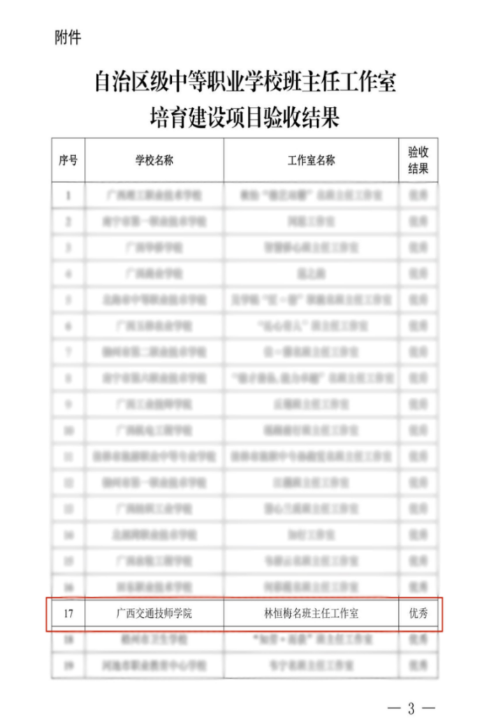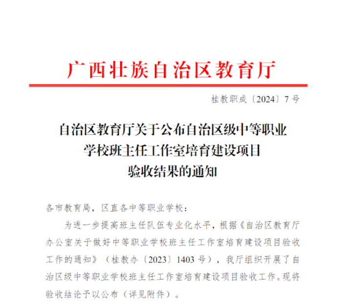 近日,廣西壯族自治區(qū)教育廳下發(fā)了(le)《桂教職成〔2024〕7 號(hào) 自治區教育廳關於公(gōng)布自治區(qū)級中等職業學校班主任工作室培(péi)育建設(shè)項目(mù)驗收結果的通知》。我院林恒梅名班主任工作室(shì)順利(lì)通過驗收,且(qiě)驗(yàn)收結果(guǒ)獲得優秀等次。