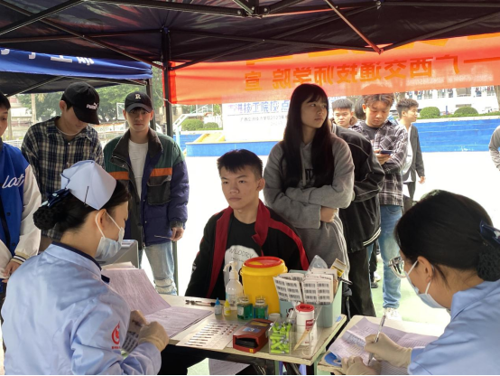 盡管天氣寒冷(lěng),但師生們的獻血熱情依舊高漲。在南寧市中心血站工作人員和誌願者們的指引下,師生們依次登記填表、化驗血型、采集血樣,整個過程井然(rán)有序(xù)。