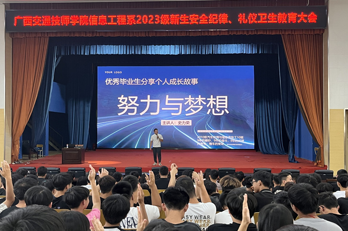在楊行銘老師(shī)的安全教育講座(zuò)完畢後,信息工程係還邀請了往屆優秀畢業生史力榮(róng)分享他在校期間的個人成長故事。史力榮通過精心準備的課(kè)件,用他豐富、專業的理論知識和多年工作經驗為同學(xué)們講解了在校(xiào)期間的成長方向和畢業之後未來規劃,幫助2023屆新生(shēng)答疑解(jiě)惑。