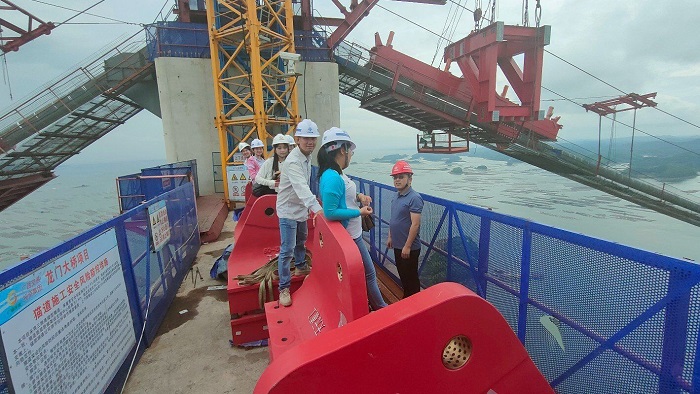 下(xià)午,教師們在安(ān)邦項目經理的帶(dài)領下,到龍門大橋施工現場進行參(cān)觀學習。期(qī)間(jiān),教師們(men)見識了標準化工地試(shì)驗室、自動化混凝(níng)土配送中心、高聳入雲的(de)塔柱、高大厚重的(de)墩柱、架設完成的主纜索股,特別是登上一百七十多米高的(de)貓道俯瞰地麵時,作為(wéi)路橋工程人的自豪(háo)感油然而(ér)生在貓道上,教師與技術人員(yuán)就橋梁的施工要點、難點進(jìn)行交流,特別是沿海地區的海風、海水、地質等地方特有(yǒu)的客觀因素對工程施工的影響及目(mù)前項目所采取的措施。