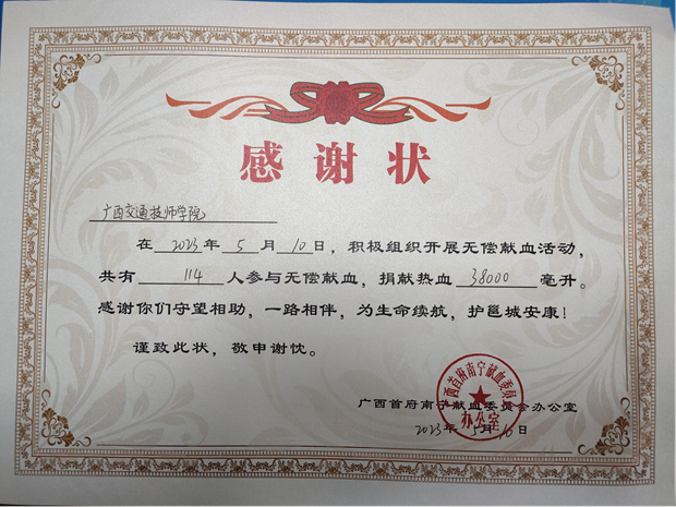 5月10日,我院聯合南寧市中心血站開展(zhǎn)“奉獻青春熱血 弘揚五四精神”為主題的愛(ài)心獻(xiàn)血活動,活動共吸引了114名師生踴躍參與,獻血量達38000毫升。