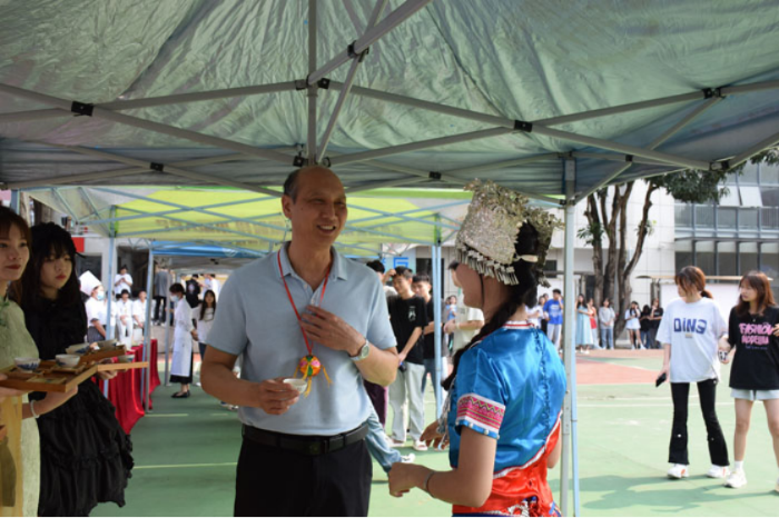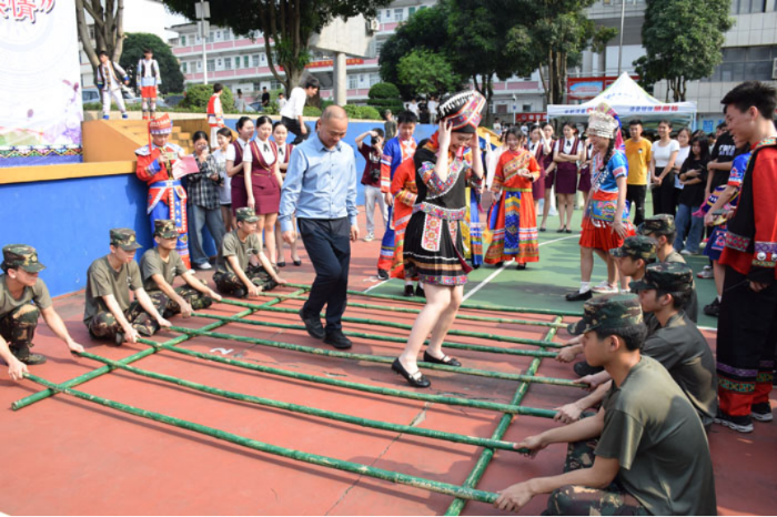學院副院長黃七零和(hé)學生一起體驗竹竿舞活動