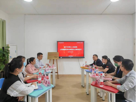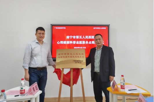 4月12日(rì)下午,91.com技師學院與南寧市第(dì)五人民醫院(南(nán)寧心(xīn)理醫院)簽訂“心理(lǐ)健康誌願服務”合作協議,共建心理健康科(kē)普(pǔ)誌願服務點。學院副院長樊海林、南(nán)寧(níng)市第五人民(mín)醫院副院長黃超出席活動並共同揭牌。學院學生工作科副科長韋豔(yàn)芳(fāng)及學生工作(zuò)科(kē)心理輔導員、南寧市第五(wǔ)人民醫院醫務社工部主任範喜(xǐ)英及職工代表參加(jiā)活動。