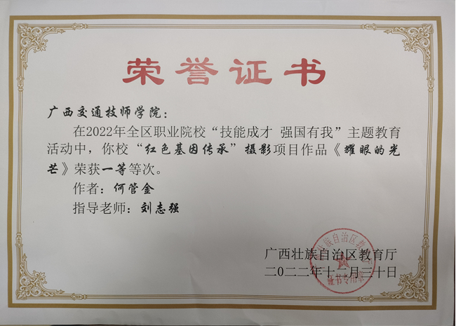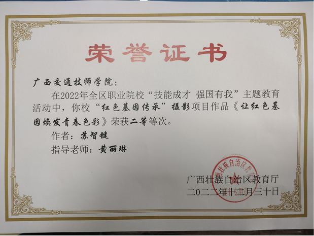 根據《自治區教育廳關於公布“技能成才強國有我(wǒ)”主題教育活動作品等次評定結果的通知》,我院在“紅色基因傳承”攝影項目中獲得了2個一(yī)等獎,3個二等獎的佳績。