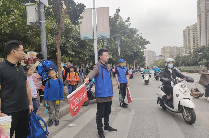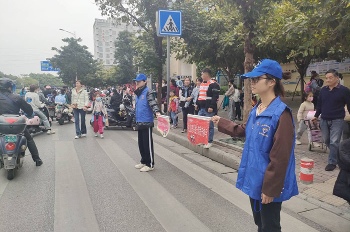 “您好,請走斑馬線!”我院誌願者們身穿藍色馬甲,頭戴藍色帽子,手持文明交通指揮(huī)旗,重點針對過往車輛不禮(lǐ)讓、行人隨(suí)意橫穿馬路等行為進行規勸、引導,維護交通(tōng)秩序(xù)。同時,對不遵守交通規則的(de)學生、家長耐心(xīn)引導,宣傳交通安全(quán)知識,倡導文明交通理念,得(dé)到了廣大師生(shēng)、家長(zhǎng)的讚揚。