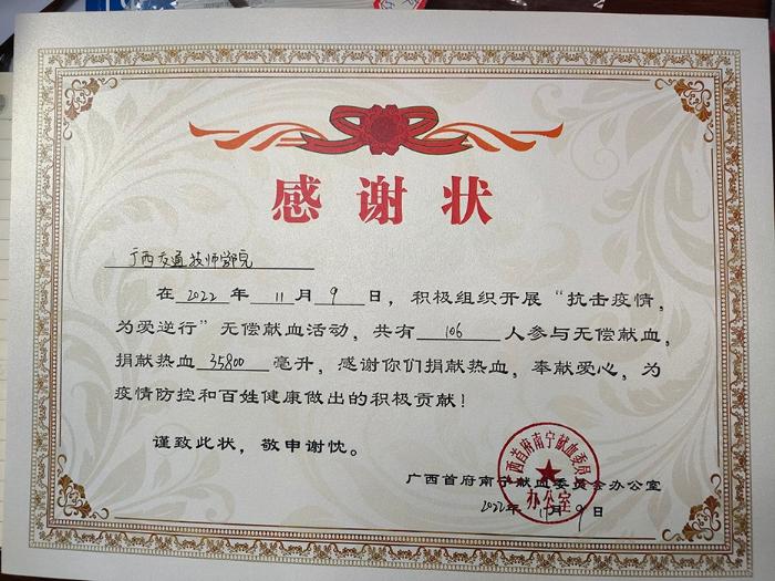 11月9日,我院聯合南寧市中心血(xuè)站開展“獻禮二十大、熱(rè)血鑄青春(chūn)、獻血勇擔當”為主題的愛心獻血活動,我院師(shī)生共106人(rén)參(cān)參與,獻血量達35800毫升。
