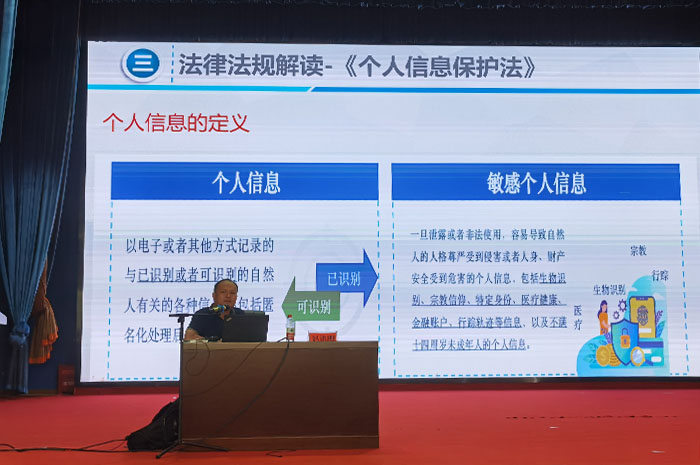 廣西工信廳信息安全測評(píng)中心產(chǎn)學研基地副主(zhǔ)任趙洪剛圍繞“網(wǎng)絡安全為人民,網絡安全靠人(rén)民”的主題,通過具體案例和理論知識,從網絡安全發展(zhǎn)趨(qū)勢、網絡安全(quán)法律法(fǎ)規解讀、網絡信息安全等方麵向大家介紹如何(hé)提高網絡安全意識,提(tí)醒教職工和同學(xué)們(men)要提高警惕,擦亮雙眼,分(fèn)辨真偽,加強網絡安全意識。