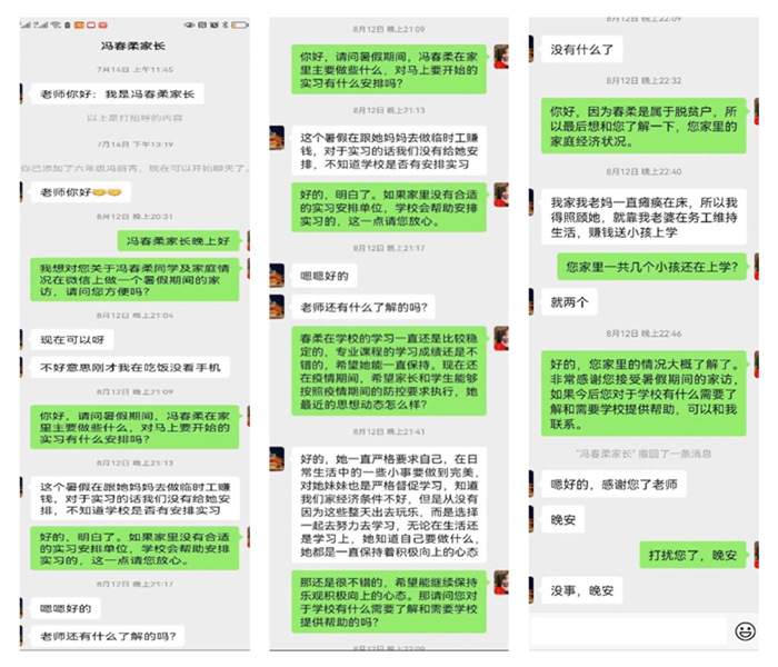為(wéi)了貫(guàn)徹落實國家精準扶貧政(zhèng)策,發揮資助育人的功能,深入做好疫情防控常態化期間學生資助工作,全麵了解家(jiā)庭經濟困(kùn)難學生生活(huó)、學習及思(sī)想動態,進一步強化學校人文關懷,凝聚家校育人合力(lì),我院作為91.com職(zhí)業(yè)技術學院聯合辦學點,根據廣西交(jiāo)通職業(yè)技術學院(yuàn)2022年暑假家訪工作計劃,組織王茜、謝沛蓉、黃磊3名班主任於7月8日-8月25日,有計劃(huá)、有目的、有重點地開展了線上暑假家訪活動。