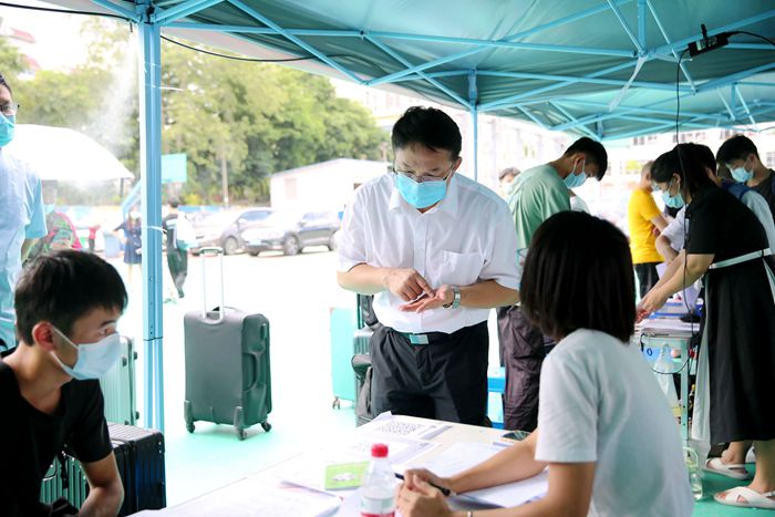 為確(què)保新生入學工作安(ān)全有序,學院提前進行部署,將疫(yì)情防控作為新生入學報到工作的重中之重,從嚴落實各項(xiàng)防控措施,暫緩中高風險地區新生報到,符合報到條(tiáo)件的低風險地區新生入校(xiào)必(bì)須持48小時內核酸檢測陰性證(zhèng)明、健康碼綠(lǜ)碼以及行程碼綠碼方(fāng)可入校。安保人員嚴格值勤、巡邏、維護秩(zhì)序、消(xiāo)毒(dú)行李,提(tí)醒入校新生及家長全程佩戴(dài)口罩、保持安全間隔、測量體溫;校醫24小時在校門口、健康觀測點(diǎn)值守,切實保障師生(shēng)健康……