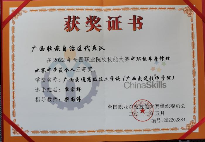 【強國複興有我】我院覃宏祥同(tóng)學榮獲2022年全(quán)國職業院校技能大賽(中職組)車身修理賽項三等(děng)獎