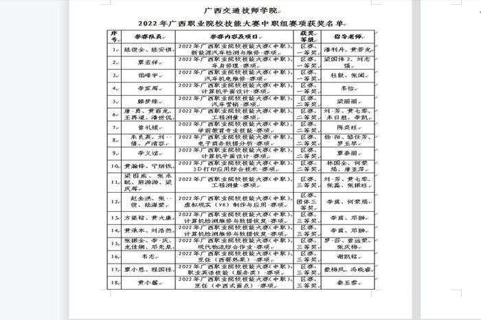 本次大賽學院共組織23個參賽隊參賽,經過激烈角逐,我院比賽團(tuán)隊在眾多參賽隊中脫穎而出,共計17個參賽隊獲獎,其(qí)中獲一等獎4項、二等獎6項(xiàng),三等獎7項。汽車(chē)工程係“汽車機電維修”“車身修理”“新能源汽車檢測與維修”3個賽(sài)項(xiàng)代表廣西進入國賽,參加全(quán)國職業(yè)院校技能大賽。