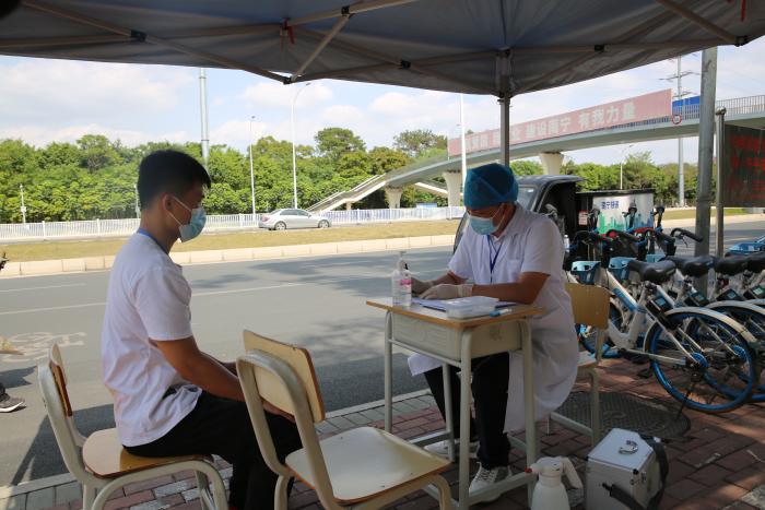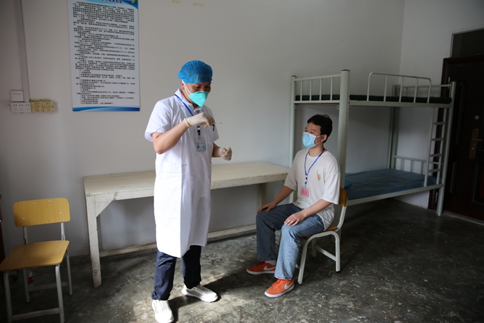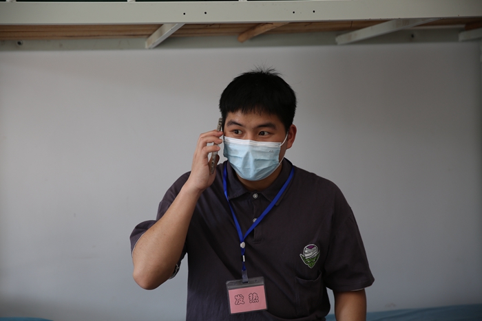 校醫在臨(lín)時隔離留觀區詢問體溫異常學生(shēng)的症狀和流行病學史(shǐ)