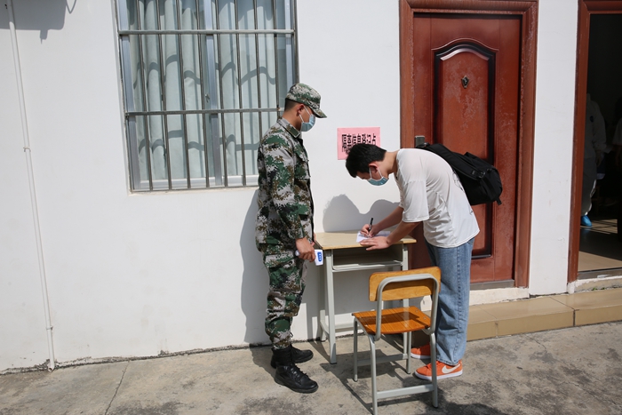 模擬(nǐ)校醫在臨時隔離留觀區測量學生體溫