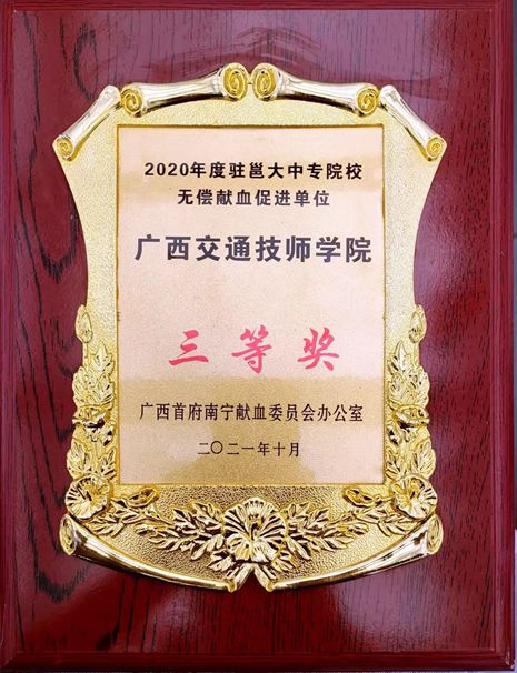 我院榮(róng)獲2020年駐邕大中專(zhuān)院校無償(cháng)獻(xiàn)血(xuè)促進單位三等獎