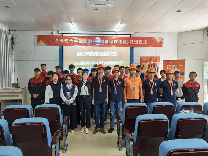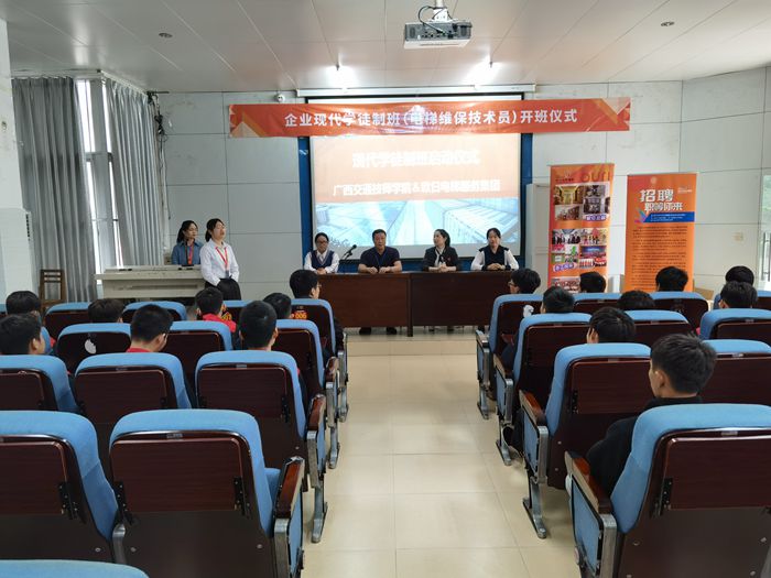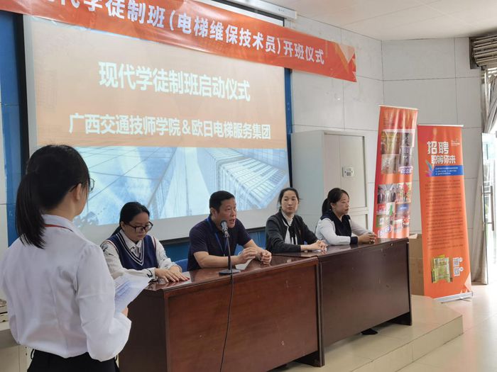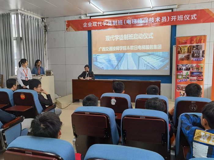 1011日上午,我院機電工程係與廣西歐日電梯服務集團有限公司校企合作的歐日電梯現代學徒製訂單班開(kāi)班儀式(shì)在邕武校區求知樓階梯教室順利舉行。機電(diàn)工程(chéng)係(xì)主(zhǔ)任(rèn)周(zhōu)茂傑,歐日電梯公司維保(bǎo)事(shì)業部總經理張巍慰、人事部(bù)經理魏紅梅出席開班儀式,歐日電梯維保訓(xùn)練(liàn)團(tuán)隊和訂單班學生共計33人參加儀式。