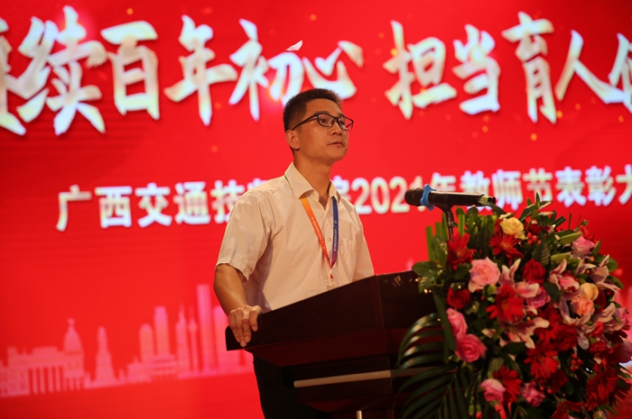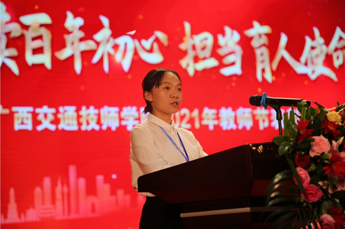 第七屆廣西技工院校專業(學科)帶頭人、自(zì)治區級技能大師羅宗港老師和全國技工院校教師職業能力大賽廣西選拔賽一等獎獲得者(zhě)覃春麗老師分別上台發言,紛紛感謝學院為教師成長搭建大平(píng)台,使他們(men)能夠充分施展才華和本領,表示將銘記(jì)自治區交通運輸廳(tīng)、學院領導的殷切期望,不忘教(jiāo)師立(lì)德樹(shù)人之初心,牢記教書育人之使命,承載起學院領導(dǎo)和學生家長的(de)囑托與希望,履職盡責(zé),引(yǐn)導(dǎo)關愛學生,傳道授業解惑,為培養交通運輸行業高技能人才而(ér)不懈(xiè)努(nǔ)力。2021年新入職的教師代(dài)表李思穎老(lǎo)師表示(shì),將在今後的教學生涯(yá)中,多向優秀教師和優秀教育工作者們學習,將(jiāng)個(gè)人發展與學(xué)院發展結合起來,充分利(lì)用好各項政策和平台,奮發(fā)有為、奮勇前行,為學院高質量(liàng)發展貢獻自(zì)己的力量。