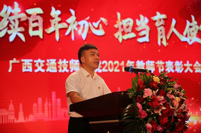 一支粉筆,兩袖清風,三尺(chǐ)講台,四季耕耘;立(lì)德樹人,培根鑄魂;為黨育人,為國育才。學院未來的美好藍圖需要全體教師用勤勞和智慧去描繪,希(xī)望全體教師向優秀教師和優秀教育工作者、先進(jìn)個(gè)人學習,牢(láo)記教師是人類(lèi)靈魂工程師這一美譽、誓言,耐得住清貧(pín),守得(dé)住初心,以飽滿的熱情、昂揚的鬥誌,投入到新學年的工(gōng)作(zuò)中、學習中去,共同(tóng)創造廣(guǎng)西交通技師學院美好、輝煌的明天。