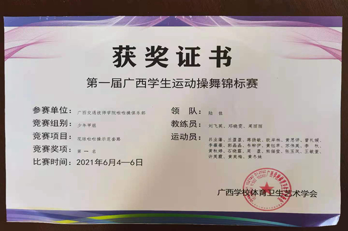 我院喜獲2021年(nián)第一屆廣西學生運動操舞錦標賽花球(qiú)啦啦操示範套路少年(nián)甲組冠軍