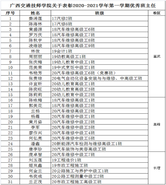 2020-2021學年第一學期共評選出31位優秀班主任,名單如下: