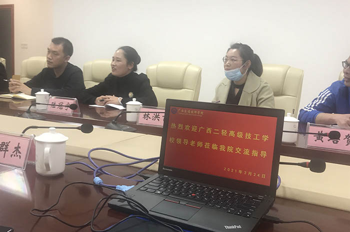 2021年3月(yuè)24日下(xià)午,廣(guǎng)西(xī)二輕高級技工學校公共基礎部主任陸冠宇、副主任林浩吉等一行(háng)8人(rén)到我院進行(háng)交流學(xué)習,我院基礎學(xué)科(kē)部主任(rèn)陸(lù)佳、各教研(yán)室主任及相關課目代表參加此交流活動。