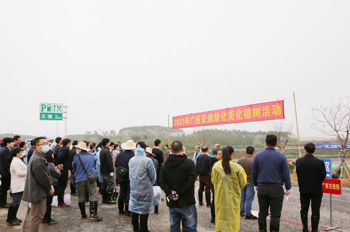 植樹活動現場,自治區交通運輸廳副廳長韋勇球作講(jiǎng)話。他表示,2021年是中國共產黨成立100周年,是開啟全麵建設社會主(zhǔ)義現代(dài)化國家新征程(chéng)的第一年,是“十四(sì)五(wǔ)”開局(jú)之年,我區交通綠化美(měi)化工作要認真(zhēn)踐行習近平(píng)生(shēng)態文明思(sī)想,按照“建設壯(zhuàng)美廣西(xī)、共圓複興夢想”的(de)總(zǒng)目標總要求,以“起步就要提速、開局就(jiù)要爭先”的奮鬥姿態,紮實推進綠色交通建設,為我區營造山清(qīng)水秀的自然生(shēng)態做好先行、提(tí)供保障。