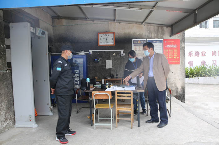 圖(一):黨委書記(jì)鍾修仁同誌檢查長堽校區保安門崗出入登記情況