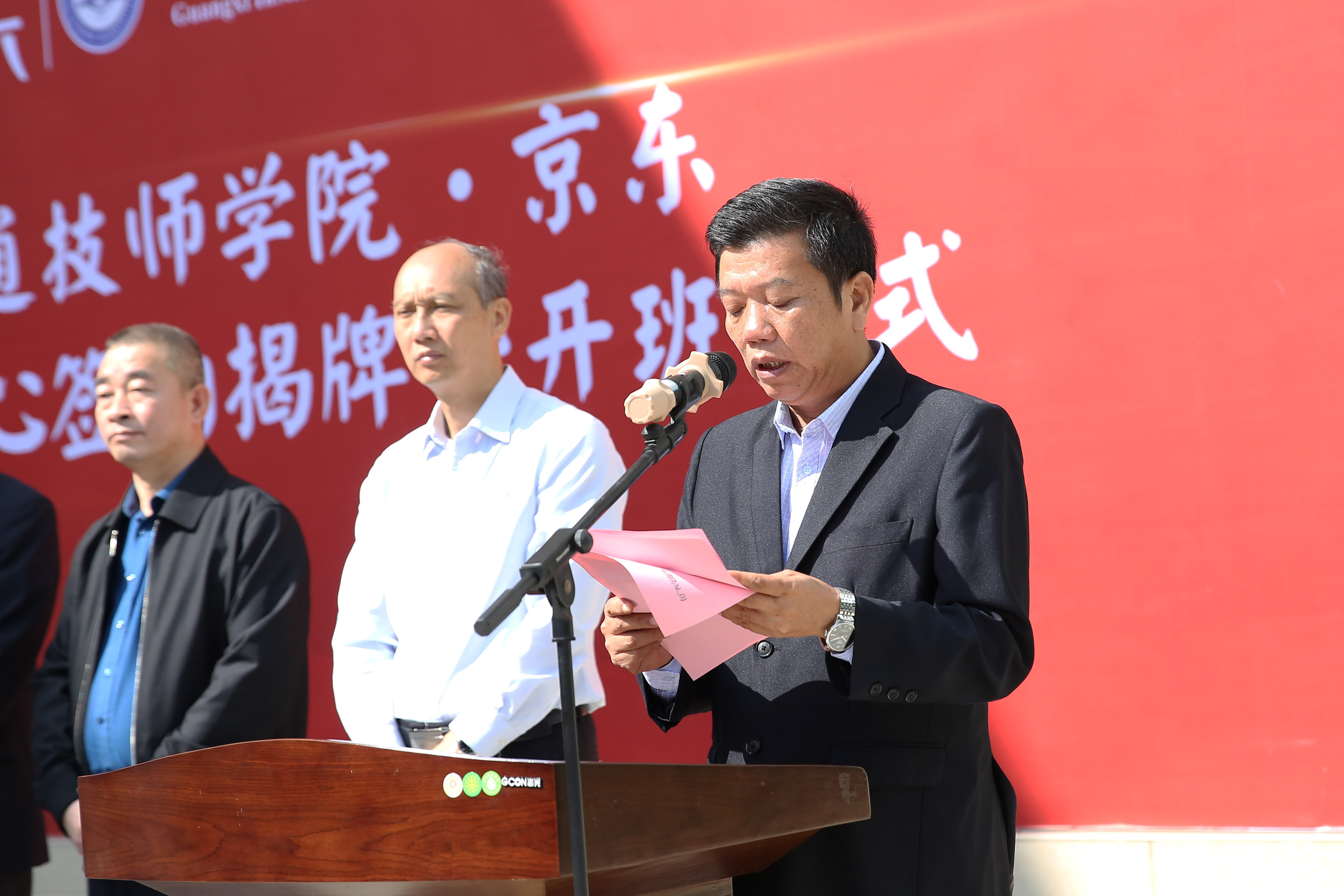 廣西(xī)交通技師學院黨委書記鍾修仁代表學院向一(yī)年來支(zhī)持學校建設(shè)與(yǔ)發展的江蘇京東信息技術(shù)有限公司表示誠摯的謝意,向“京東校園(yuán)實訓(xùn)中心”的順利揭牌表示祝賀。他指出,揭牌暨開班儀式(shì)的舉(jǔ)行(háng),是我(wǒ)院與(yǔ)江(jiāng)蘇京東信息技(jì)術有限公司(sī)校企(qǐ)共育、深度合作的成果。未(wèi)來,學院將繼續(xù)秉承“校企合作,深度融合”的原則,進(jìn)一(yī)步推動(dòng)京東校園實訓基地建設,在(zài)校(xiào)企師資共享、企業課題研究等方麵進行全方(fāng)位的深度合作與(yǔ)協商,不斷探索(suǒ)新舉措與江蘇京東信(xìn)息技術有限公司(sī)共同致(zhì)力推動該項目向著更好更深(shēn)的層次發展,為社會經濟發展培養更多優秀技能人(rén)才。