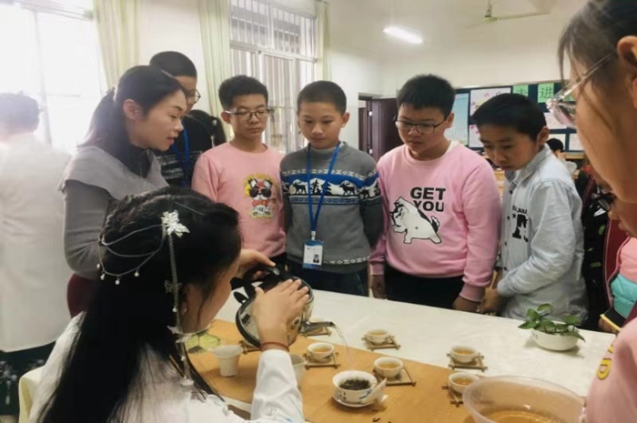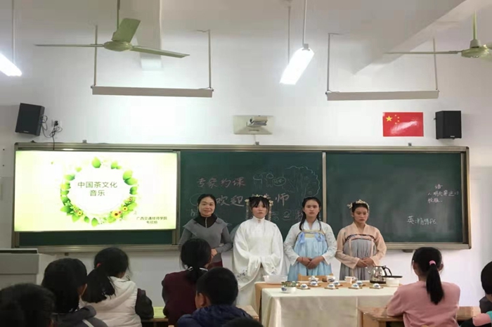 12月4號星期三下午,我院韋欣烜老師帶領茶藝社成員(yuán)前往廣西大學君武小學,開展(zhǎn)中國茶文化音樂課程,為同學們展示中國茶文化的魅力。