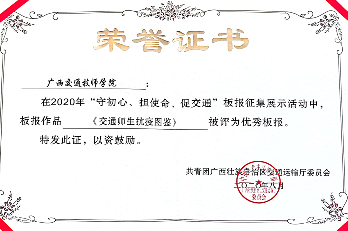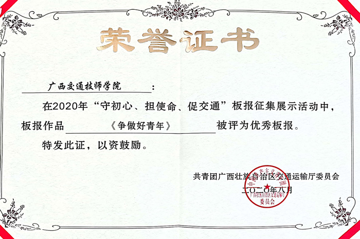 共青團廣西壯族自治區交通運輸廳委員會舉辦了2020年“守初心、擔使命、促交通”板報比賽,我院團委選送的參賽(sài)作品《爭(zhēng)做好青年》和《交通(tōng)師生抗疫(yì)圖鑒》榮獲本次比賽的(de)“優秀板報”獎。