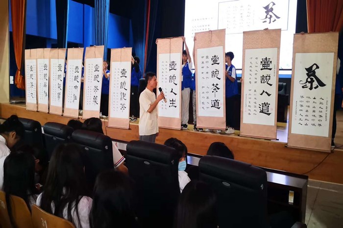 唐銘會長向學生介紹並展示了一套完整的(de)《壺說人生(shēng)》、《壺說茶道》、巜壺(hú)說八道》等九幅完整的茶文化係列(liè)書法作(zuò)品,向學生深(shēn)入淺出地講解了我國博大精深的茶文化和茶道養生知識,這種互動式(shì)的體驗,讓同學們興(xìng)趣倍(bèi)增、收獲頗豐。本次講座(zuò)不僅展示了中華傳統文化之美,也增長了同學們的茶文化知識(shí),使同學們在茶藝的魅(mèi)力中溝通思想、放鬆身心,提升了對(duì)修身養性(xìng)的感悟和理解。