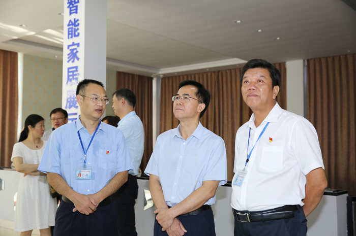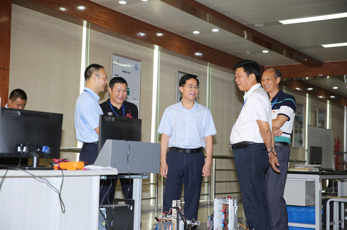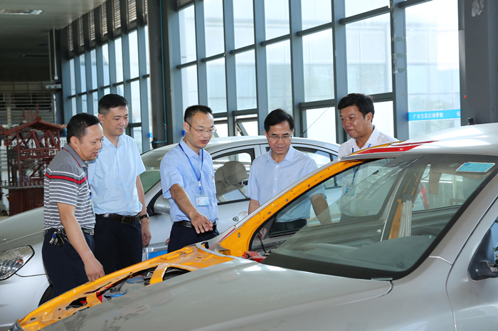 我院領導(dǎo)陪同自治區交通運輸廳韋勇球副廳長(中)參(cān)觀考察機電工程實訓基(jī)地(dì)