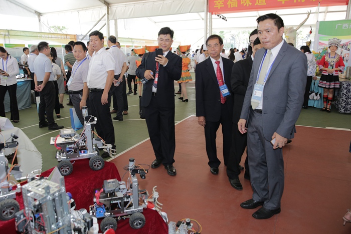 自治區教育廳廳長唐鹹(xián)僅(左(zuǒ)一)到我院展位參觀指導(dǎo)