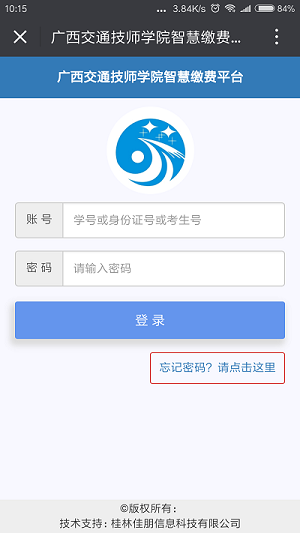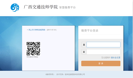 第一步:在電腦上登陸91.com技師學院智慧繳費平台(xf.gxjt.cn),輸入學號,密碼(mǎ)(如(rú)未修改151617級學生默認為66666618、19級默認為身份證後六位),點擊登陸(lù)。