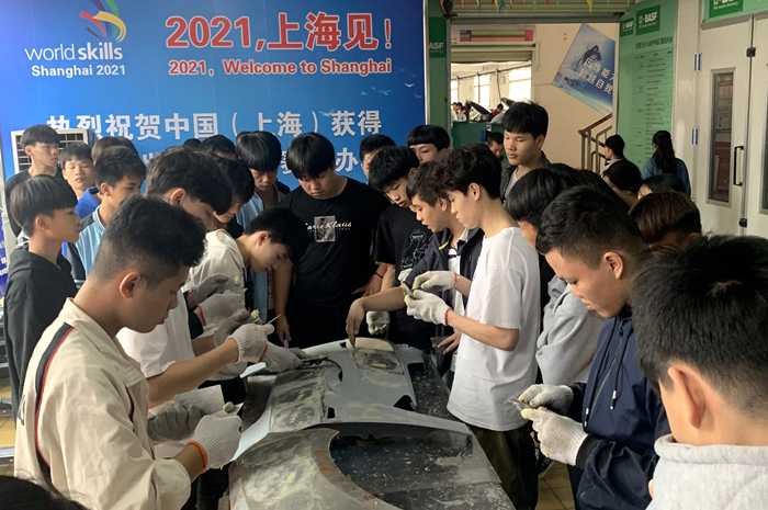 我院學生進行汽車翼子板(bǎn)刮原子灰(huī)展示