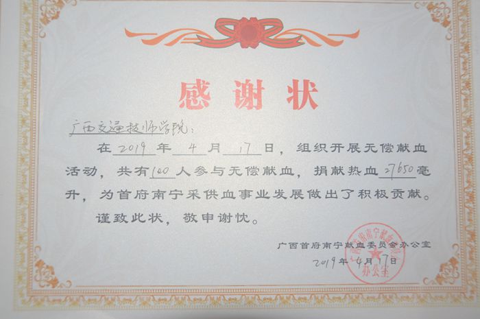 此(cǐ)次活動(dòng)持續到晚上將近7點,得到了廣大同(tóng)學的積極響應(yīng),據統(tǒng)計共有(yǒu)100名師生參與了無償獻血,獻血27650毫升,展現了我院師(shī)生的熱情與愛心,為首府南寧采供血事業發展(zhǎn)做出了積極(jí)貢獻。我院從2006年開始(shǐ),每年都組織愛心獻血活動(dòng),由此也連續十二年被廣西首府南寧獻血委員會評為駐邕大中(zhōng)專院校無償獻血促進單位,是駐(zhù)邕中職院校唯一(yī)一所獲得此殊榮的學校。