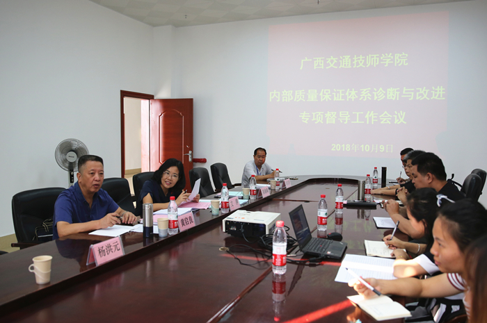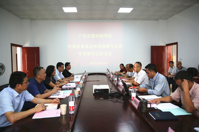為深入(rù)推進全區職業院校內部質量保證體係診斷與(yǔ)改進(簡稱“診改”)工作,建立健全內部質量(liàng)保(bǎo)證製度體係,10月9日上午,自治區職業院校內部質量保證體係診斷與改進專項(xiàng)督導組(zǔ)一行5人到我院開展督導工作。學院黨委書(shū)記古雅明,副院長陸天雲、關菲明,院長(zhǎng)助理(lǐ)樊海林(lín)以及相關部門中層正職領(lǐng)導等參(cān)加了診(zhěn)改督導工作會議。