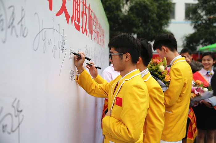 第44屆世界技能大賽工業機(jī)械裝調項目金牌選(xuǎn)手宋彪、塑料(liào)模具(jù)工程項目金牌選手張誌斌、移動機器(qì)人項目銅(tóng)牌選手梁(liáng)灶容在簽名牆上簽名