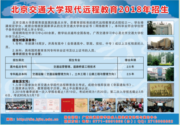 北京交通大學是教育部直屬的重點大學,為教(jiāo)育部批準的現代遠程教育試點院校之一。我院自2002年與北京交通大學聯合辦學以來,每年麵(miàn)向社會和學校招生,主要(yào)有(yǒu)高起專、專升本兩個層次,以教學豐(fēng)富(fù)、文化底蘊深厚、學習形式輕鬆一直深受廣大學員的喜(xǐ)愛和好評(píng),每年都有大批在(zài)職學員慕名前來報考。同時(shí),北京交(jiāo)通(tōng)大學現代遠程教育為我院學生學曆提升(shēng)提供了通道,解(jiě)決了畢業(yè)生因學曆不足而遇到的工資待遇、人事考試、職稱評定、考證(zhèng)、留學等問題。聯合辦學以來,每年累計都有數百名(míng)學生取得專科或本科畢業證書。熱烈歡迎廣大學員前來(lái)我院報讀,我們將以熱情的服務圓您一個大學夢(mèng)!