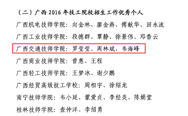 近日,根據2016年招生工作開展情況及辦學環境等因素綜合評價,自治區人力資(zī)源和社會保障廳對全區技工院校開展了2016年技工院校招生工作優秀單位、優(yōu)秀個人推薦評(píng)選工作。我(wǒ)院榮獲廣(guǎng)西2016年技(jì)工院校招生工作優秀單位,學院羅瑩(yíng)瑩、周林斌、韋海峰等3位教師榮獲廣西2016年技工院校招生工作優秀個人。