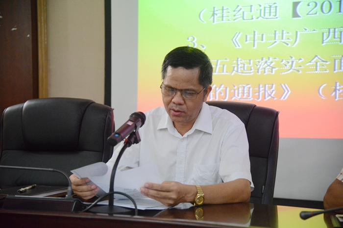 會上,陸天雲副院長通報了《關於六起高校領導幹部違反中央八項(xiàng)規定(dìng)精神問題(tí)的通報》(中紀通[2017]3號)、《中共廣西壯族自治區紀律檢查委員會關於九起扶貧領域腐敗問題典型案例的通報(bào)》(桂紀通[2017]9號)、《中共廣西壯族自治區紀(jì)律檢查委(wěi)員會關於五起落實全麵從嚴治黨主體責任不(bú)力典型問題(tí)的通報》(桂紀通[2017]10號)三個文件精神。