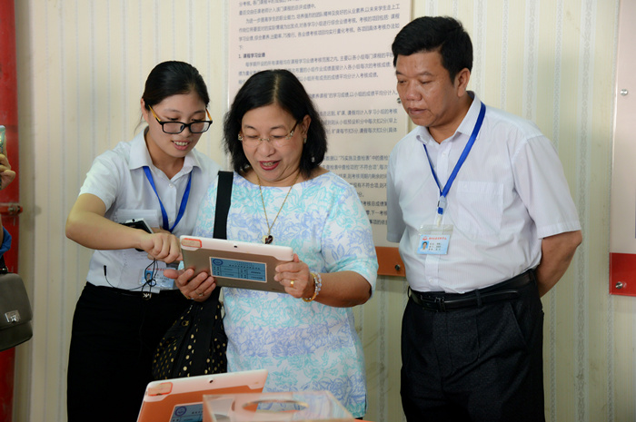 國(guó)際勞工組織亞太局專(zhuān)家卡梅拉·托雷斯(中)參觀(guān)我院物流管理專(zhuān)業“智慧課(kè)堂”