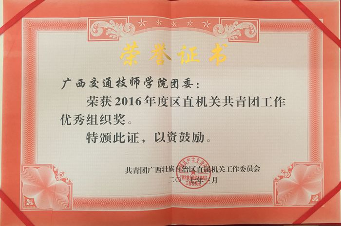 2016年(nián),我院團委(wěi)在學院黨委和學院(yuàn)領導的關懷和幫助下,主動承(chéng)擔、保質保量地完成團區委和區直團工委交辦的任務,為區直機關共(gòng)青團的創新發展貢(gòng)獻了自(zì)己的力量,獲得了年度區直(zhí)機(jī)關共青團工(gōng)作“優秀組織獎”,並且我院是連續三年獲(huò)此殊榮的中職院校。