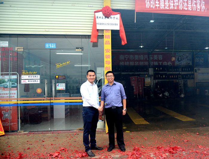 我院招生就業處副主任覃甫(左)與奧緣汽車美(měi)容維修服(fú)務部總經理(lǐ)李炳宣(右)宣布掛牌儀式成功
