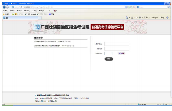 即日起,考生(shēng)可以登錄http://www.gxeea.cn/ “2016 年普(pǔ)通高校招生全國統一考試預報名”進行預報(bào)名,對《高考報(bào)名表》(預報名)進行填報。首次登錄的用戶名為考生第二代身份證號碼,密碼為身份證號的最後4 位數字。考生首次登錄的界麵如下: