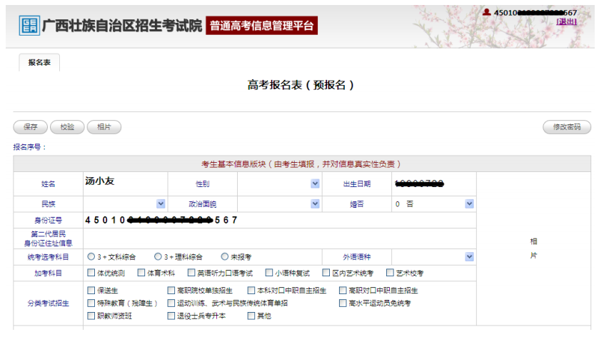 考生填寫好預報名信息保存後(hòu),再次登錄(lù)時會提示考生修改密碼。在現場確(què)認之前,可以多次登錄,點擊校驗按鈕進行校驗,查看(kàn)信息並核對與修(xiū)改。