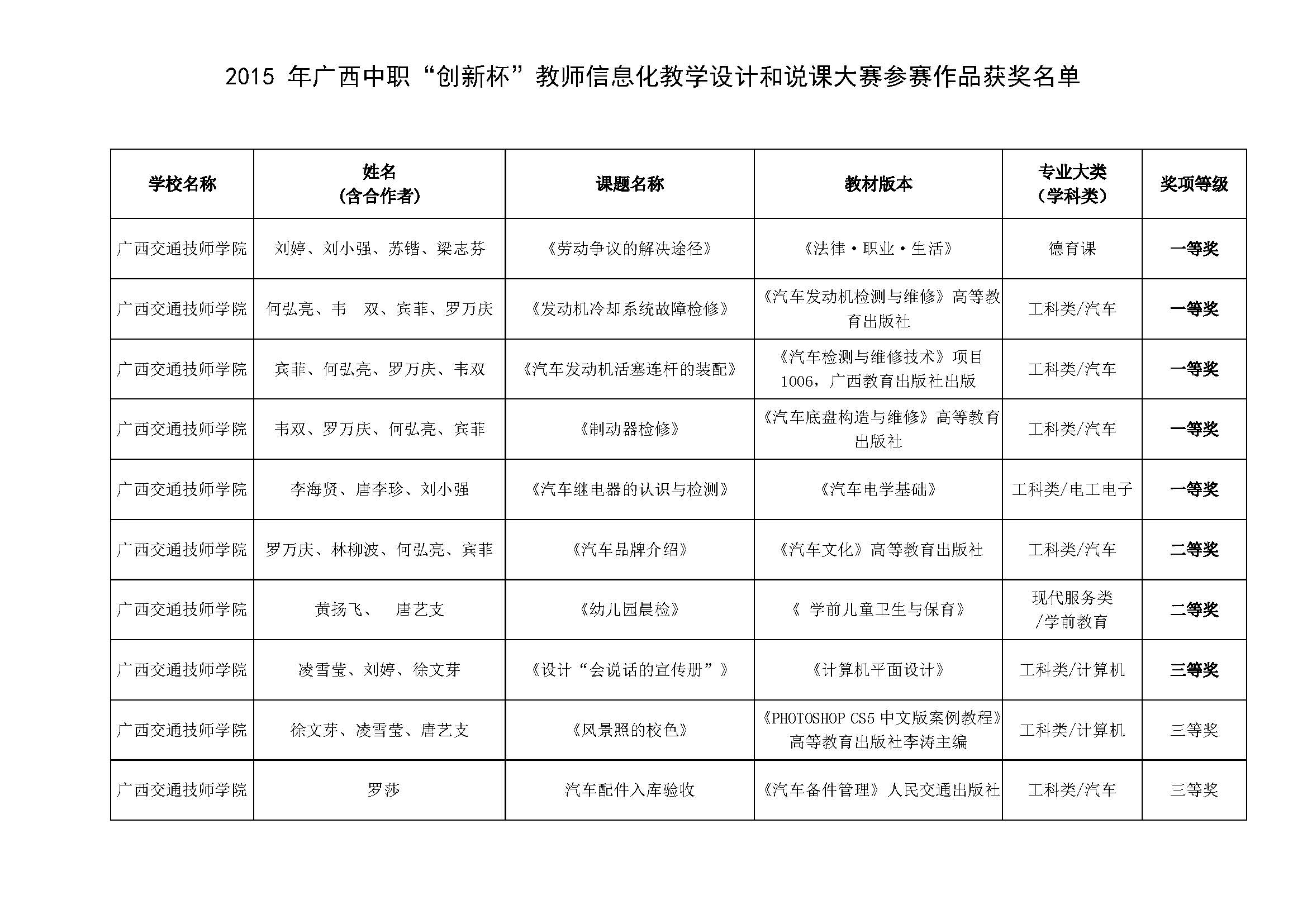本次大(dà)賽由廣西中等職業教育教學改(gǎi)革指導中心組織(zhī),旨在提升中職院(yuàn)校教(jiāo)師應用現代化教育技術手段和數(shù)字化資源能力,促進教師素質和教學質量的提高,選拔優秀作品和教師參加2015年全(quán)國中等職業學校“創新杯”教師信息化教學設計和說課(kè)大賽。本次大賽中,全區共45所中職院校,226個作品參加比賽,經過激烈的角逐,我校選送的12個作品中共有10個作品獲獎,分別為:一(yī)等獎(jiǎng)五(wǔ)項,二等獎兩項,三等獎三(sān)項。其中《勞動爭議的(de)解決途徑》、《發動(dòng)機冷卻係統故障檢修》、《汽車發動機活塞(sāi)連杆的(de)裝配(pèi)》、《製動器檢修(xiū)》、《汽車繼電器的認識與檢測》、《汽車品牌介紹》等6個作品入選廣西集(jí)訓隊;何(hé)弘亮、賓菲、韋雙、劉婷4位老師經過集訓隊的嚴格培訓和甄選,最終脫穎而出,成功晉級國賽隊,並將於10-11月參加全國總決賽。