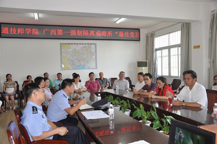 為加(jiā)深黨員幹部(bù)對毒(dú)品危(wēi)害社會的(de)感觀認識,強化思想防範,第三(sān)黨支部踐行“三嚴三實”。在副院長陸天雲的帶領(lǐng)下,黨支部28名黨員幹部於(yú)2015年(nián)6月30日前往(wǎng)廣西第一強製隔(gé)離戒毒所(以下簡稱戒毒所)開展黨員(yuán)警示教育活動。