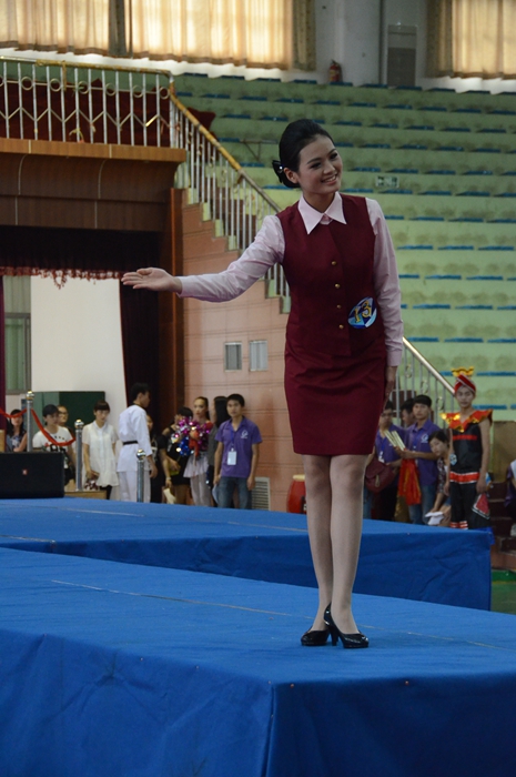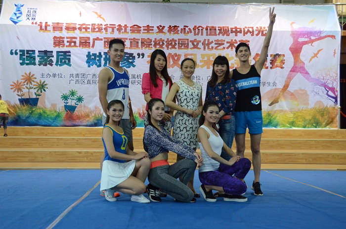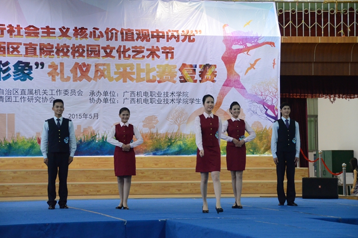 5月9日下午,第五屆(jiè)區直院校校園文化藝術節“強素質 樹形象”禮儀風采比賽中職組(zǔ)總決賽在廣西(xī)機電(diàn)職業技術學院體育館進行。經過初賽的角逐,共有10個學校的代表隊進入決賽,每支代表隊的人數為5人,每隊由三女兩男組(zǔ)成。決賽由禮儀(yí)裝展示與團隊介紹和團隊個性服裝(zhuāng)展示(shì)兩部(bù)分組(zǔ)成。在信息與商務係的劉飛英老師、周(zhōu)麗麗老師和陳蕾旭三位老師(shī)的帶領下(xià),13汽車維修與鈑(bǎn)金中級工1班覃冰、14西式烹飪班黎東明、13高速公(gōng)路服務班羅菲(fēi)雲、趙思琪、李嵐五位同學組成了(le)我院代表隊參加決賽。
