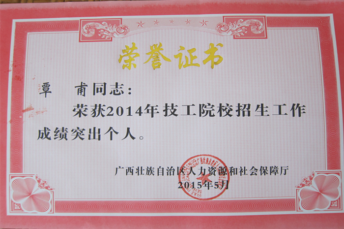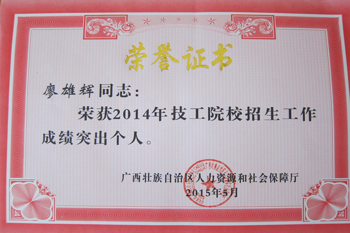 5月5日,廣(guǎng)西壯族自(zì)治區人力資源和社(shè)會保(bǎo)障廳對2014年度招生工作成績突出(chū)的15個單位以及57名教(jiāo)師進行了(le)表彰,我院被評為“招生工作(zuò)先進單位”,楊(yáng)波、毛(máo)華劍、廖雄輝、覃甫等4名老師獲得“招生工作成績突出個人”榮譽稱號。